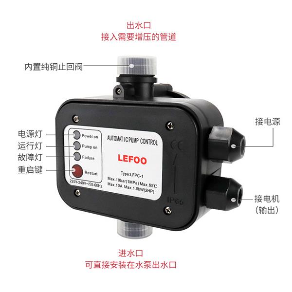 本產品是全電?智能化的?泵控制設備能完全替代由壓?罐、壓?開關、缺?保護、?回閥、四通等構成的傳統強電控制考統,集成化的設計使安裝省更多時間和材料。帶電部分與管道的完全隔離和?密封性的控制精使控制器擁有傳統開關所?法?擬的安全性,環保、壽命?、性能穩定、維修少、??等特點更加適合家庭使?。