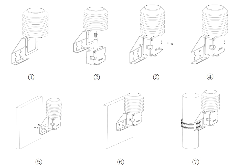 3.用螺釘和塑料膨脹管將變送器固定在墻面上(如圖5、6所示),也可以用卡箍固定在圓柱上(如圖7所示);