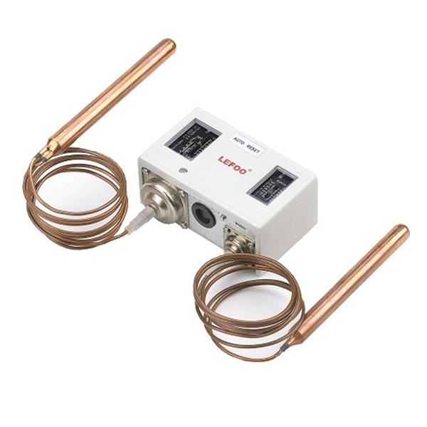 TSH型雙溫度控制器有兩個獨立的溫控功能,在制冷裝置中,為了要防止壓縮機排氣溫度過高,同時要保證壓縮機有合適的油溫,TSH型雙溫度控制器可實現此目的。將一個高溫感溫包(HT)放在壓縮機排氣口管道中,將另一個高溫感溫包(OIL)放在壓縮機的油池中,它們中間任何一個溫度超過限定溫度值時均可執行保護性停機。